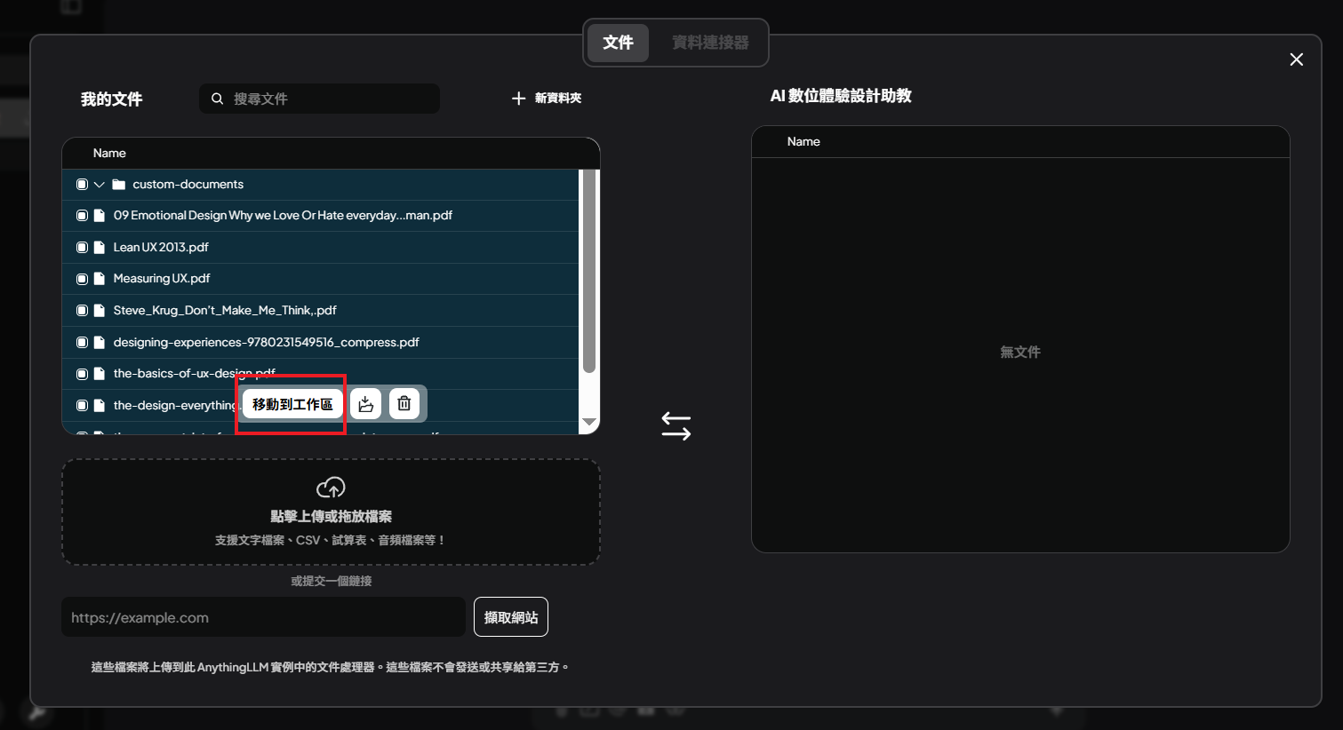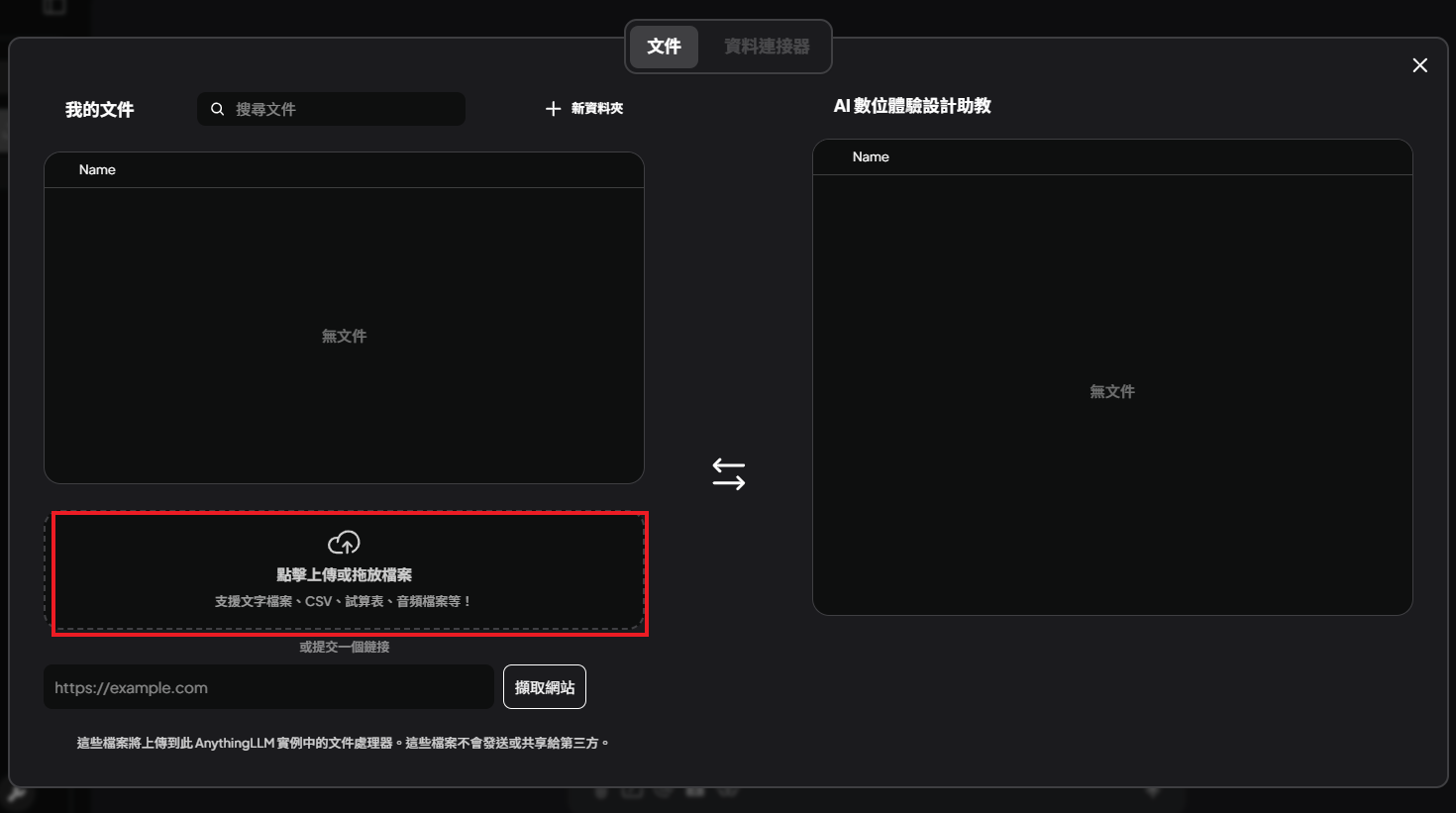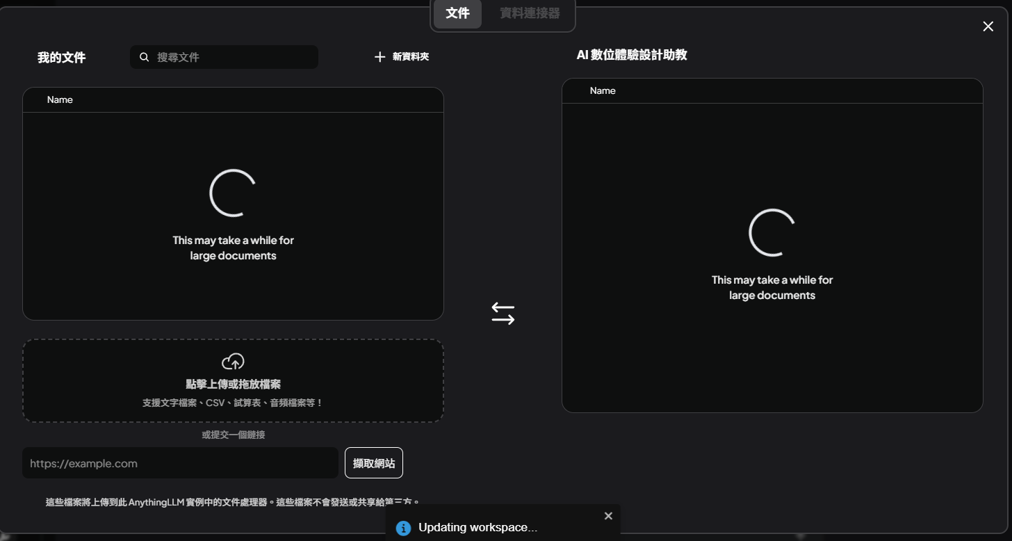 高效的文件管理:支持多種文件類型,如 PDF、TXT、DOCX 等,並通過簡單的 UI 進行管理。(目前不支援DOC格式)