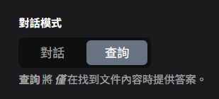 兩種聊天模式:在保留上下文的會話模式(平常使用,沒資料就直接根據LLM的知識回應)和問答的查詢模式(較嚴格,查詢到資料才回答,更減低幻覺發生)之間靈活切換。